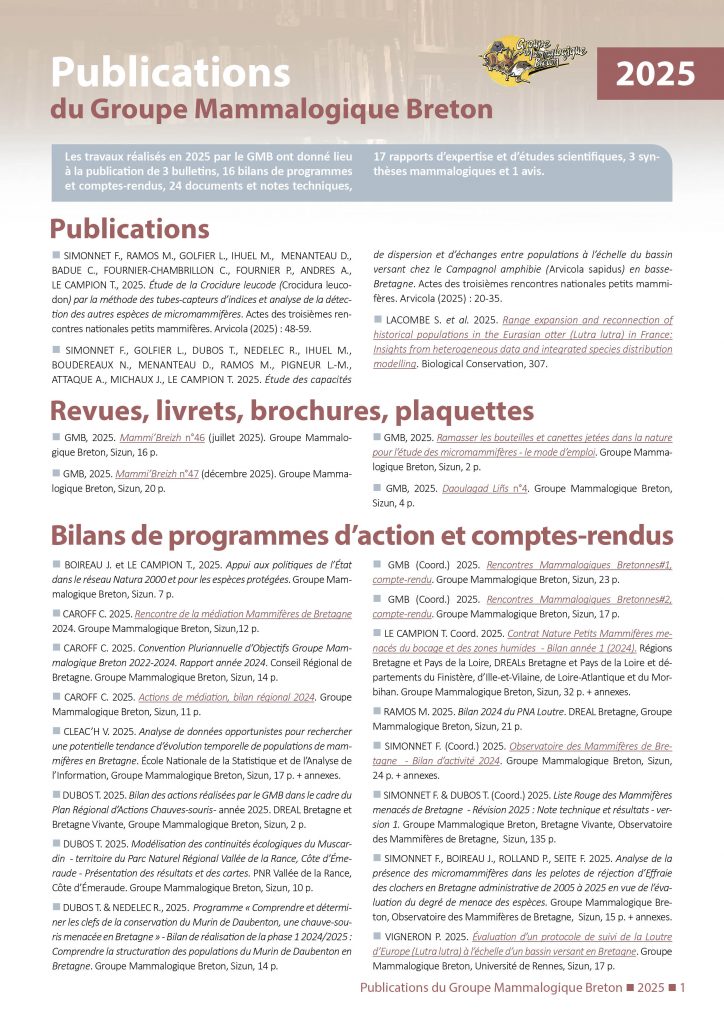 Cette bibliographie a pour objet de recenser les publications en lien avec la Bretagne ayant pour sujet, pour partie ou en totalité, les mammifères sauvages terrestres ou marins.